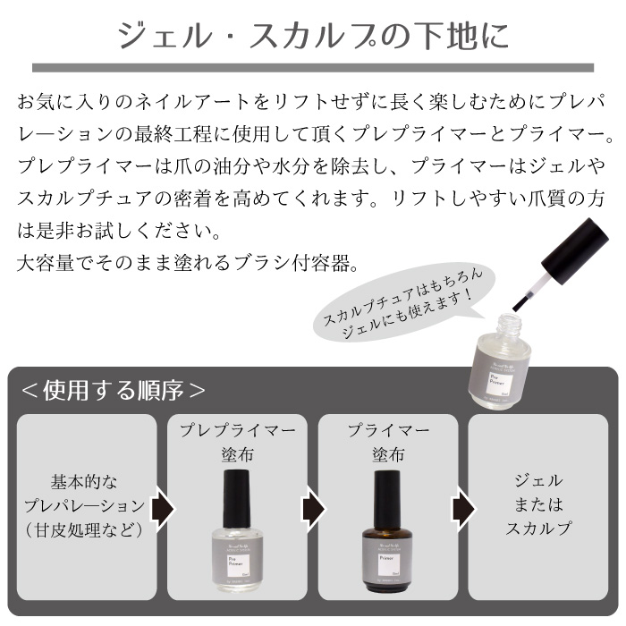 ジェルやスカルプの定着を良くし持ちをアップさせるプレプライマー&プライマー♪ スカルプチュアの必須アイテム! ※プレプライマー:爪表面の油分と水分を除去します。 ※プライマー:自爪とジェルやスカルプの密着性を高めます。 容量:15ml入"プレプライマー" について書きますね プレプライマーとは ジェルネイルのベースを塗る前に使用する ph調整剤です (メーカーによっては使用しない、 もしくはワイプと兼用だったりします。) サロンでは 「お爪の油分・水分除去をしますね」プレプライマーとは プレプライマーとはプレパレーション(下準備)の仕上げに塗布する溶剤で、 爪表面の油分と水分を除去する役割 があります。 ジェル
